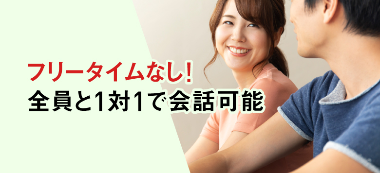 参加者全員の異性のと1対1でトークが可能ですので、初めてのご参加の方にも安心してご参加いただけます。プロフィールカードを交換してお話ししていただくので初対面の方でも会話が困る事はありません。