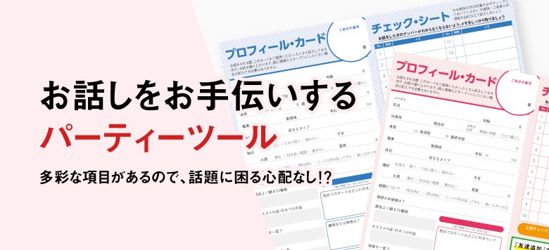 受付完了後、パーティー開始までにお席でプロフィールカードをご記入の上お待ちください。開始時刻に、司会よりパーティーの流れやルールについてご説明いたします。
