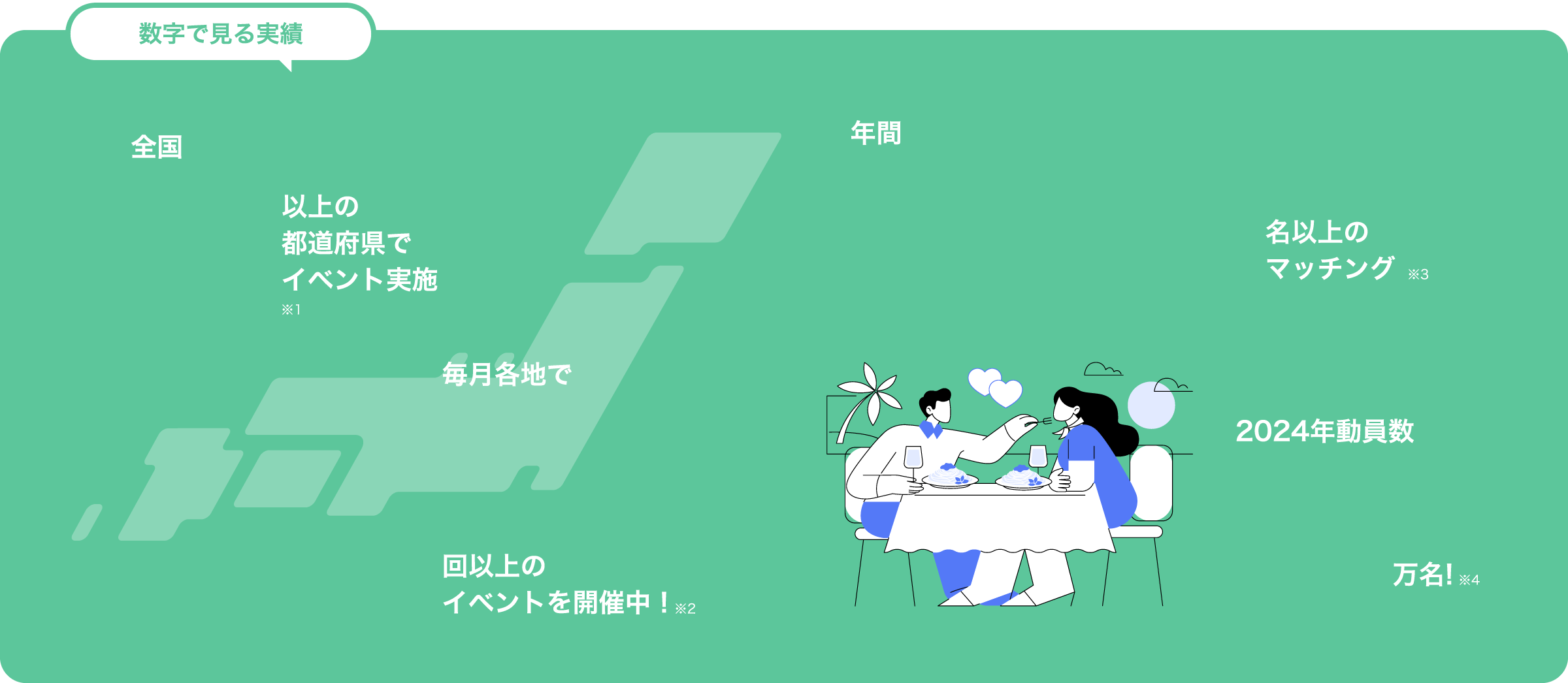 ※1…2025年5月時点 ※2…2023年度実績 ※3…2023年度実績 婚活イベントでお相手とマッチングした人数 ※4…当社主催の婚活パーティーのみ対象